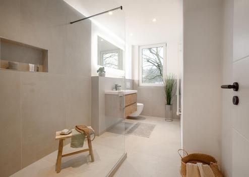• Bäder: Neue, moderne Bäder (Gäste-WC und Hauptbad) mit stilvollen großformatigen beigen Fliesen (60x120) und zeitgemäßen Sanitärkeramik (z.B. Regen-/Walk-In-Dusche).