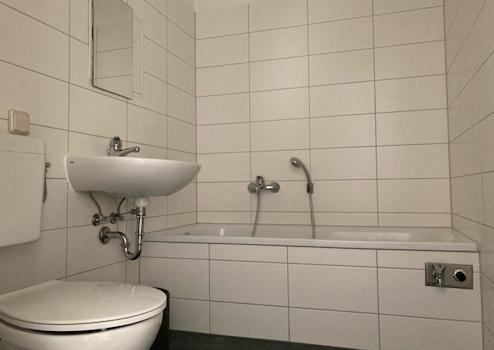 Das moderne Wannenbad ist innenliegend und präsentiert sich mit anthrazitfarbenen Bodenfliesen und hellen, zeitgemäßen Oberflächen – ein eleganter Rückzugsort für die tägliche Routine. Klare Materialien, stimmige Farbtöne und eine praktische Raumaufteilung machen die Ausstattung insgesamt stilsicher und alltagstauglich. Die Kombination aus offenem Wohnen, Balkonzugang und durchdachter Zimmerstruktur schafft ein frisches, urbanes Ambiente mit Wohlfühlfaktor.