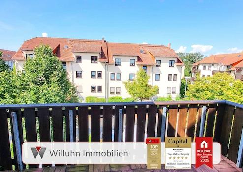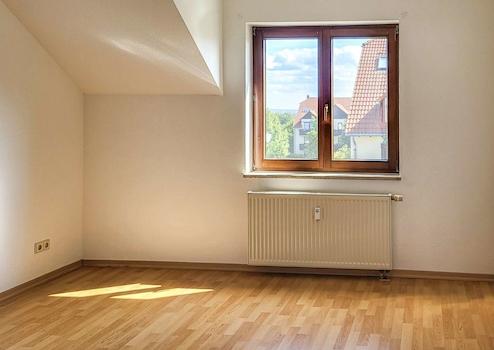 Die nach Norden gelegenen Räume – darunter das Schlafzimmer sowie ein weiteres Zimmer – sorgen selbst an warmen Sommertagen für ein angenehm kühles Wohnklima. Mittelpunkt der Wohnung ist das großzügig geschnittene Wohnzimmer, das vielfältige Gestaltungsmöglichkeiten für individuelle Wohn- und Einrichtungskonzepte bietet. Das nach Süden ausgerichtete Wohnzimmer bietet direkten Zugang zum Balkon und eröffnet einen angenehmen Weitblick über das Wohnareal bis in Richtung Wurzen.