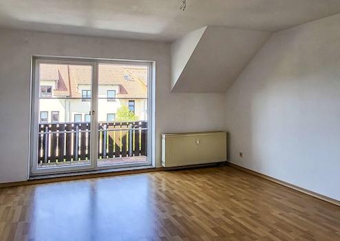 Das nach Süden ausgerichtete Wohnzimmer bietet direkten Zugang zum Balkon und eröffnet einen angenehmen Weitblick über das Wohnareal bis in Richtung Wurzen.