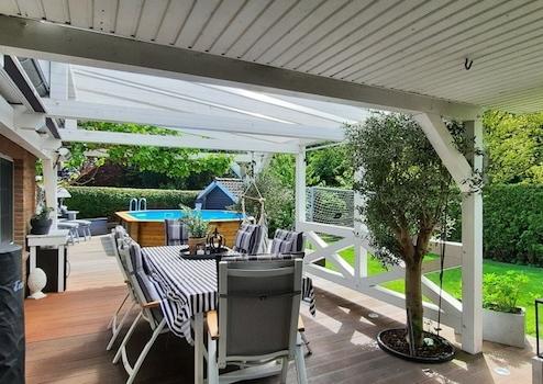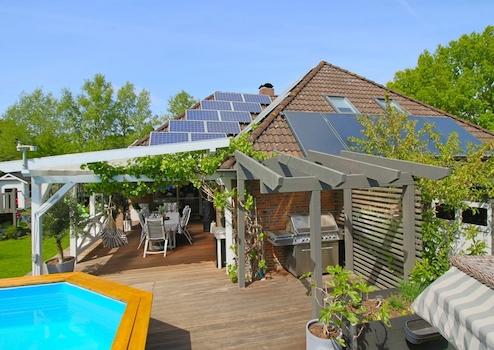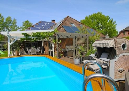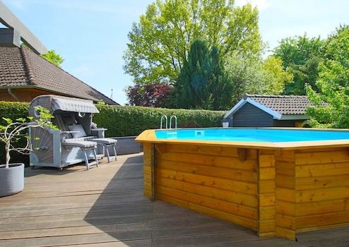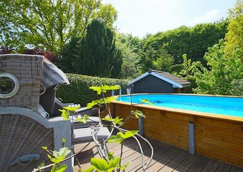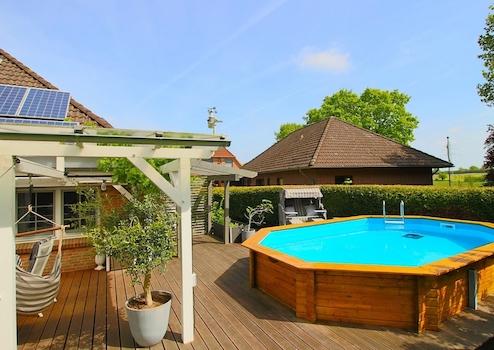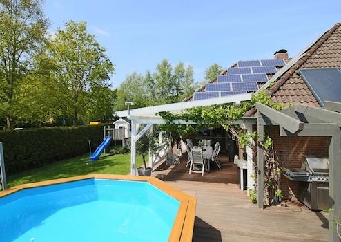 Der mit einer Wärmepumpe beheizte Pool, die große Terrasse, das Spielhaus für die Kinder und die uneinsehbare Lage machen die Außenanlagen zu einem wahren Paradies.