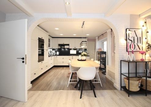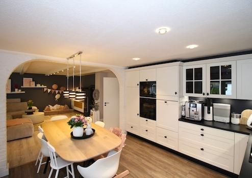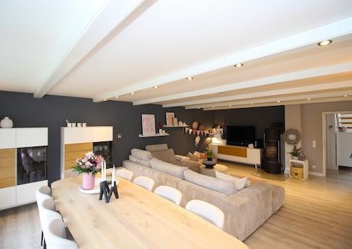 Beschreibung: Das Herzstück des Hauses bildet der offene Wohn-/Essbereich im Erdgeschoss. Durch die Sprossenfenster wird das Tageslicht wunderschön eingefangen und erzeugt ein warmes und einladendes Ambiente. Hochwertige Bodenbeläge und der stilvolle moderne Kamin sorgen für eine gemütliche Atmosphäre und machen das geräumige Wohnzimmer zu einem perfekten Ort für entspannte Abende.