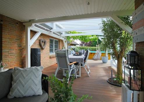 Die moderne, hochwertige Küche mit Einbauküche, welche ebenfalls im offenen Konzept integriert ist, lässt keine Wünsche für den Hobbykoch offen. Sie ist nicht nur ein Ort für Ihre kulinarischen Kreationen, sondern auch Ihr neuer Treffpunkt für Familie und Freunde. Von hier aus gelangen Sie auch auf dem direkten Weg auf die teilüberdachte Terrasse, an deren Überdachung leckere Weintrauben reifen. Am Ende der hochwertigen Bangkirai-Terrasse wartet der umweltfreundlich über eine separate Wärmepumpe beheizte Swimmingpool, der ein Traum nicht nur für Kinder darstellt.