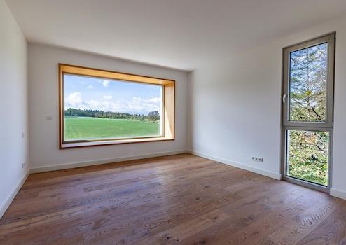 Über die Tiefgarage haben Sie – neben dem Hauseingang im Erdgeschoss, der nur über einen Fußweg erreicht werden kann - einen weiteren, exklusiven Zugang direkt ins Haus. Die Ausrichtung des Hauses konzentriert sich Richtung Süden mit Blick auf ein reizvolles, vielseitiges und vor allem unbebautes Feld. Der Ausblick zum Feld wird im Erdgeschoss durch Panorama-Schiebetüren und im 1.OG durch die Blumenfenster perfekt eingerahmt.