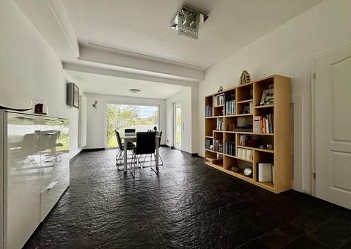 - Das weitläufige, lichtdurchflutete Wohnzimmer beeindruckt mit dekorativ verkleideter Decke, einem Naturschieferboden und einem großen Panoramafenster Richtung Garten.