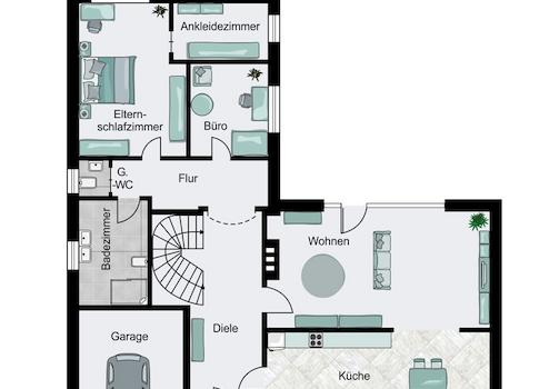 Im Erdgeschoss stehen Ihnen ca. 120m² Wohnfläche zur Verfügung. Diese verteilen sich auf einen großzügigen Eingangsbereich, von dem aus Sie in die offen gestaltete Küche mit angrenzendem Wohn- und Essbereich gelangen. Ebenfalls im Erdgeschoss befinden sich ein Büro- bzw. Kinderzimmer, das Elternschlafzimmer mit begehbarem Kleiderschrank, ein Gäste-WC sowie ein Badezimmer mit bodengleicher Dusche und Handtuchwärmer.