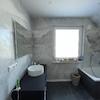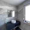 Das Gäste-WC mit Fenster, Designer Waschbecken mit einem Unterschrank wurde hochwertig mit edler Seidentechnik verputzt.