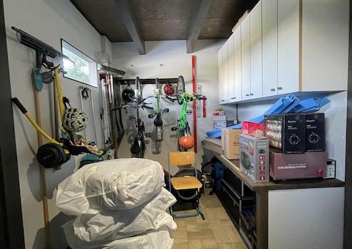 Zusätzlich ist Gartenausstattung wie Rasenmäher, Streuwagen und Gardena-Schlauchsystem vorhanden.