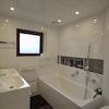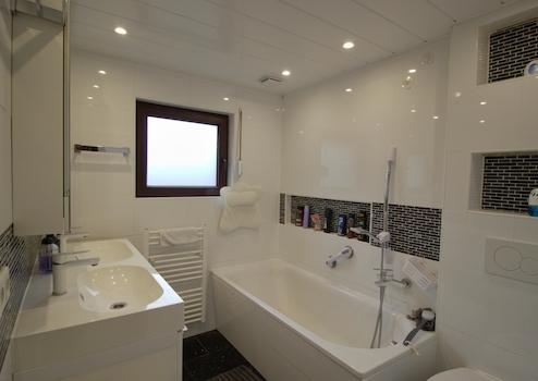 Das zeitgemäße Badezimmer präsentiert sich hell und modern und verfügt über ein Fenster.