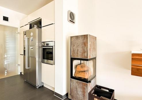 Der stilvolle Eckkamin (Marke Spartherm) kann optional gegen Aufpreis von 3.500 € übernommen werden.