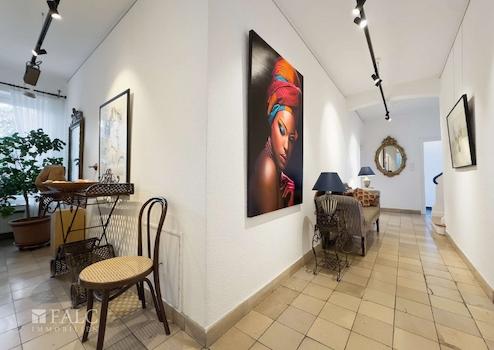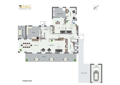 - Erdgeschoss mit Wohnbereich, Verandazimmer, Küche, Gäste-WCs und separatem Praxis- bzw. Bürotrakt mit 4 Zimmern & Duschbad