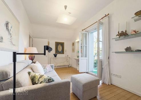 Der zentrale Flur des Hauses ist großzügig, mit Solnhofener Fliesen belegt, und führt geradewegs auf die restaurierte Holztreppe zu – ein Blickfang mit Charakter. Auf der linken Seite öffnet sich der Wohnbereich mit offenem Kamin, schönen Parkettböden, vielen Fenstern mit Blick in den Vorgarten und viel Platz zum Leben. Das angrenzende Verandazimmer kann über eine Schiebetür geöffnet oder abgetrennt werden – je nach Anlass. Von dort aus geht es sowohl auf die überdachte Terrasse und in den Garten als auch direkt in die Küche mit Gartenblick und Sicht auf den Kirchturm von St. Pankratius.