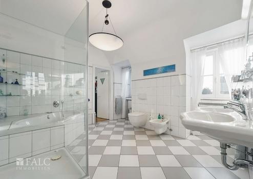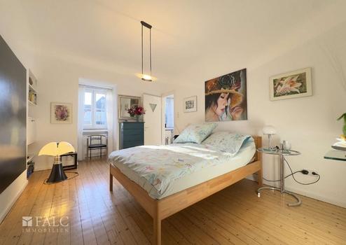 Das größte Schlafzimmer liegt ruhig und verfügt über einen Kaminanschluss. Besonders ist der direkte Zugang zum angrenzenden Badezimmer: hell, großzügig und ausgestattet mit Eckbadewanne, Dusche, Doppelwaschbecken, Bidet und WC. Das Badezimmer ist zusätzlich auch vom Flur aus begehbar. An das Badezimmer schließt ein weiterer Raum an, der sich ideal als Ankleide, Bibliothek oder Kinderzimmer eignet – und zusammen mit dem Bad und dem Hauptschlafzimmer eine Art Elterntrakt bilden kann. Dennoch bleiben drei weitere Zimmer übrig, die sich flexibel nutzen lassen – ob für Kinder, Gäste oder Hobbys.