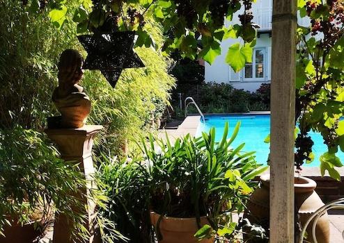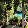 Eines der Zimmer verfügt über einen eigenen Balkon mit Blick in den Garten und auf den Pool – ein echtes Highlight für ruhige Stunden im Freien.