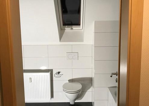 Das Badezimmer verfügt über Tageslicht und ist mit Wanne, großem Waschbecken und Hänge-WC sehr komfortabel ausgestattet.