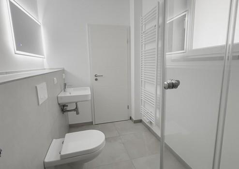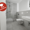 • Neues Badezimmer: Markenarmaturen von Grohe, Sanitärsysteme von Geberit, Emaille-Duschwanne mit Regendusche, moderne Großformat-Feinsteinzeugfliesen, Handtuchheizkörper, Waschmaschinenanschluss