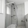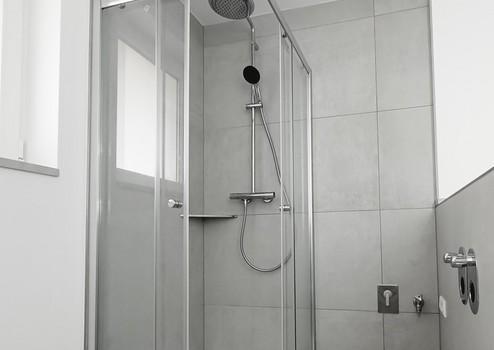 Das modern gestaltete Badezimmer besticht durch hochwertige Markenarmaturen und eine Emaille Duschwanne, welche mit einer Regendusche ausgestattet ist. Hochwertiges großformatiges Feinsteinzeug deutscher Herstellung verleihen dem Raum eine elegante, moderne und pflegeleichte Optik. Ein Handtuchheizkörper sorgt für wohlige Wärme, und ein vorgesehener Anschluss bietet Platz für die Waschmaschine.