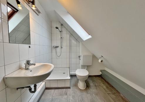 Das moderne Duschbad lässt keine Wünsche offen: Neben einem Fenster für Tageslicht und gute Belüftung bietet es eine Dusche, eine neue Toilette sowie einen Anschluss für die Waschmaschine.