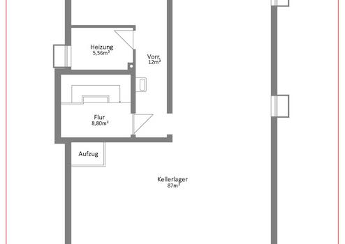 Im gesamten Kellergeschoss befindet sich das Lager, ein Anschlussraum sowie der Heizraum. Die monatliche Miete für die gesamte Gewerbeeinheit beträgt monatlich EUR 1.875 zzgl. Nebenkosten.