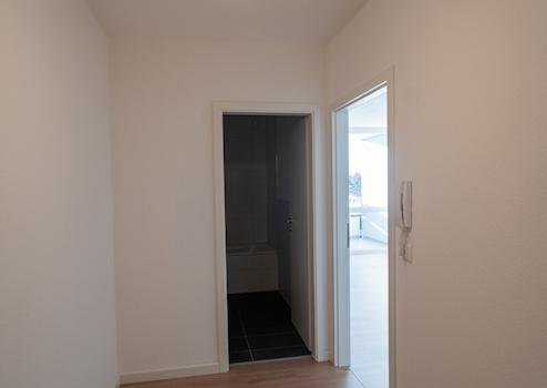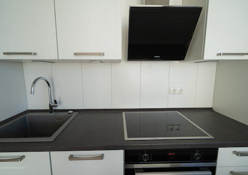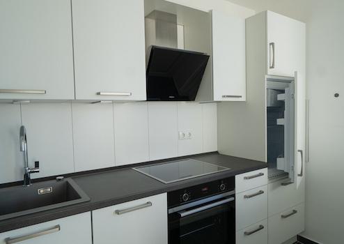 Weiterhin erhielt die Wohnung eine neue Einbauküche. Sie ist ausgestattet mit einer Arbeitsplatte, einem Spülbecken, einer schmalen Spülmaschine, einem E-Herd mit Cerankochfeld, einem Backofen, einem Dunstabzug und einem Einbaukühlschrank mit Gefrierfach. Verschiedene Unterbau- und Hängeschränke in der Farbe Weiß sind vorhanden.