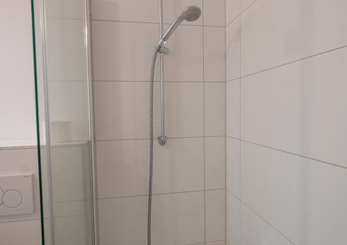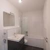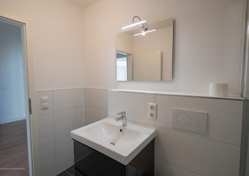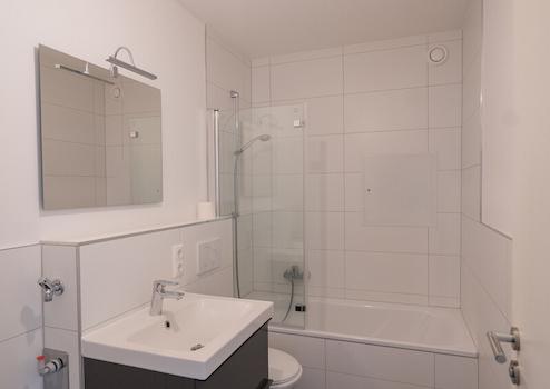 Das Badezimmer erhielt im Zuge der Renovierung einen modernen Touch. Großformatige, weiße Wandfliesen sowie dunkle Bodenfliesen zieren das Bad. Ein Waschtisch mit Schubladen und einem Spiegel, eine Toilette und eine Badewanne mit Glasduschtrennwand sind vorhanden. Ebenso ist das Bad mit einem Waschmaschinenanschluss ausgestattet.