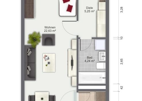 Die Wohnung befindet sich in der zweiten Etage eines vierstöckigen Hauses. Ein Aufzug ist selbstverständlich vorhanden. Der wohnfreundliche Grundriss bietet eine Diele, ein Badezimmer, eine abgeschlossene Küche mit Fenster sowie ein Wohn- und Schlafzimmer. Als echter Wohlfühlgarant beweist sich die gemütliche, westlich ausgerichtete Loggia. Diese erreichen Sie vom Wohn-/Schlafzimmer aus.