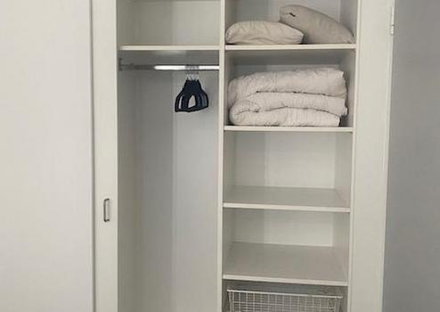 *Schlafzimmer: Das ruhige Schlafzimmer verfügt über einen großzügigen Einbauschrank und ein hochwertiges weißes Bett der Marke Ruf und eine Federkernmatratze der renovierten Marke RUF (1,60m x 2,00m) ausgestattet mit Verdunkelungsplissees für einen erholsamen Schlaf.