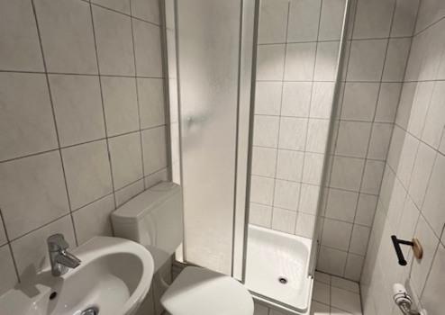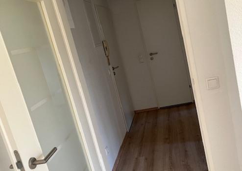 Die Wohnungseingangstüre erschließt den Dielenbereich – links das Badezimmer mit Dusche, WC und Waschtisch – daneben das Schlafzimmer – dann die Küche mit neuer Einbauküche und im Anschluss das Wohnzimmer.