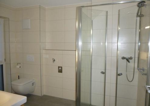 Ein geschmackvoll ausgestattes Tageslicht-Bad mit begehbarer Dusche und WC
