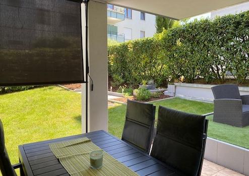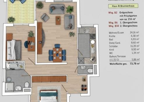 Die Wohnung ist mit einer Fußbodenheizung ausgestattet und verfügt über eine überdachte Terrasse sowie einen großzügigen Garten mit Gartenhütte. Zusätzlich gibt es einen gemeinschaftlich nutzbaren Hobbyraum inklusive Sauna.