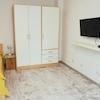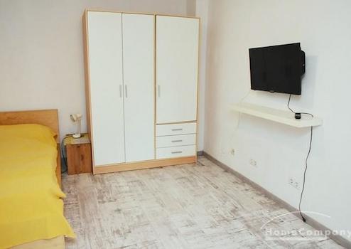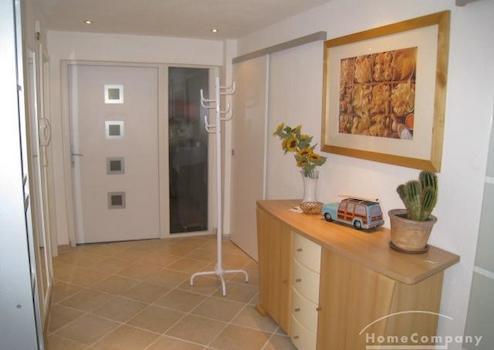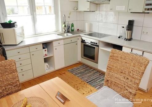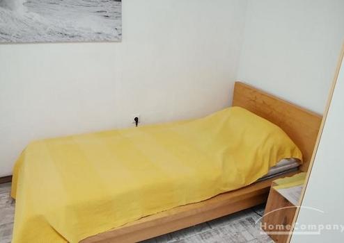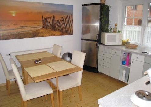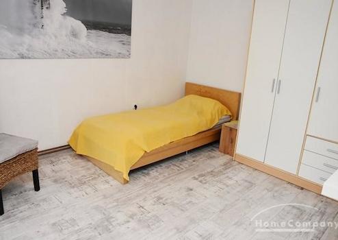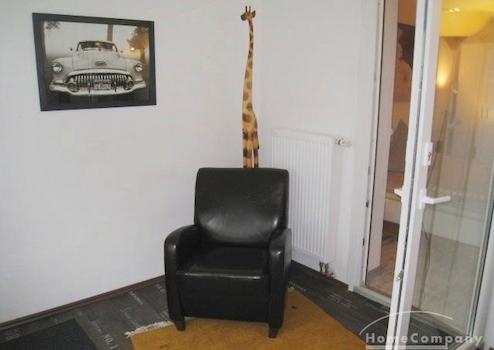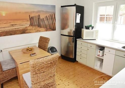 Mehrfamilienhaus in ruhiger Straße. Modern möblierte Wohnung, Kiefernholzmöbel. Wohnzimmer mit Couch, Tisch, Kommode, Vitrinenschrank, Korbstuhl, Schreibtisch mit Stuhl, DVBT-TV. Schlafzimmer mit Doppelbett, Kommode, ...