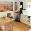 Wintergarten mit Sessel, Schrank, Kaffeemaschine.