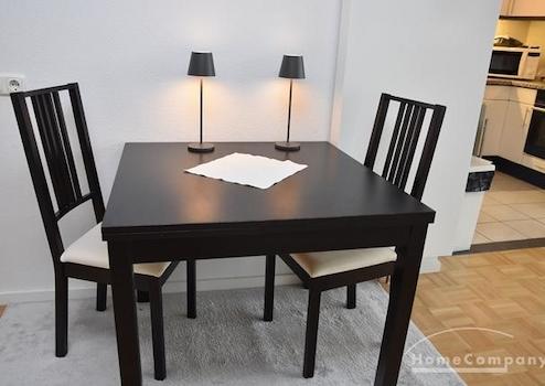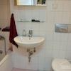 Mehrfamilienhaus in ruhiger Straße. Modern möblierte Wohnung, Kiefernholzmöbel. Wohnzimmer mit Couch, Tisch, Kommode, Vitrinenschrank, Korbstuhl, Schreibtisch mit Stuhl, DVBT-TV. Schlafzimmer mit Doppelbett, Kommode, ...