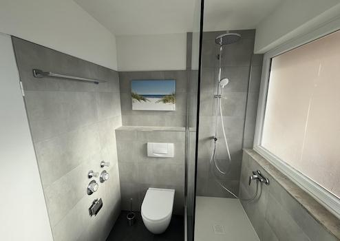 Das an den Eingangsbereich angrenzende, neu renovierte Bad verfügt über eine Dusche mit Regenschauerfunktion. Ein großer Spiegelschrank mit Extralicht und Steckdose gibt mehr als genug Raum und Platz, die eigenen Bad-Accessoires unterzubringen. Zudem beinhaltet das Bad eine Bosch-Waschmaschine.