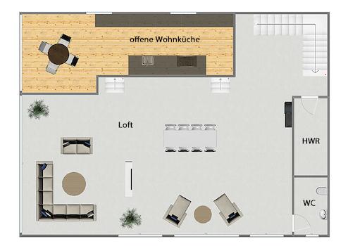 - großzügiger Wohn- und Essbereich mit offener Wohnküche im Loft im Obergeschoss