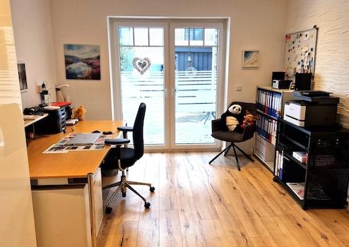 Der Wohn-, Ess- und Küchenbereich, Flur, Vollbad, Hauswirtschaftsraum, Gäste-WC, Speisekammer sind gefliest (Feinsteinzeug). Die weiteren Zimmer haben einen Laminatboden.