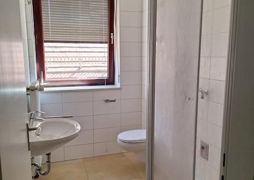 Das Badezimmer ist zeitgemäß gestaltet und bietet eine Dusche sowie einen eigenen Waschmaschinenanschluss; alternativ kann die Waschmaschine im gemeinschaftlichen Waschraum aufgestellt werden.