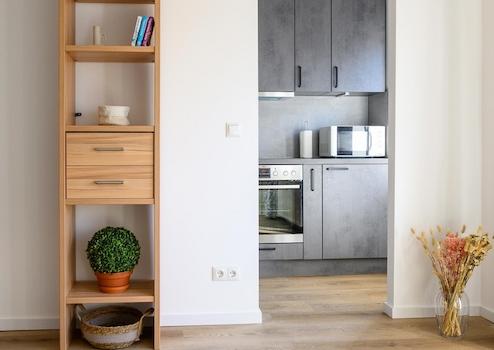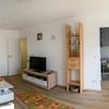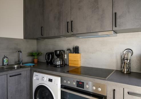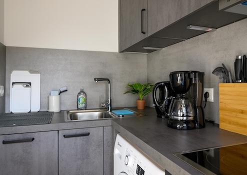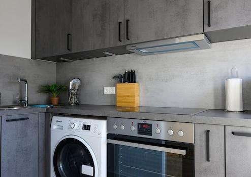 In der neuwertigen Küche mit edler Farbgebung befindet sich neben einem Geschirrspüler und einem Backofen mit Elektroherd außerdem ein Kühlschrank, eine Edelstahl-Spüle, eine Kaffeemaschine, ein Toaster sowie moderne Hängeschränke, die zusätzlichen Stauraum bieten. Das großzügige und helle Wohnzimmer sorgt durch den hohen Lichteinfall über die großen Fenster für eine besonders freundliche Atmosphäre und wird mit dem Zugang zum Balkon mit Westausrichtung und Blick ins Grüne abgerundet.