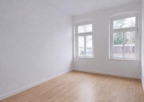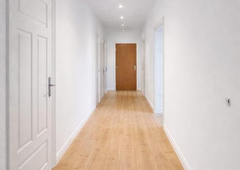 Die Wohnung befindet sich in einem sehr gepflegten Zustand und überzeugt durch eine moderne, helle Ausstattung. Alle Wohnräume sind frisch gestrichen und mit weißen Tapeten versehen. In den Zimmern liegt ein hochwertiger Laminatboden im warmen Pinie-Farbton, ergänzt durch weiße Fußbodenleisten. Große Fenster in allen Räumen sorgen für viel Tageslicht und ein angenehmes Wohnambiente.