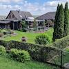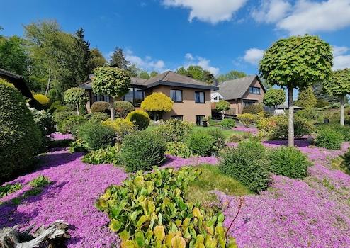 Der Garten ist wirklich extraordinär schön, von vielen Passanten als der schönste Garten Eudenbachs angesehen, und trotzdem pflegeleicht angelegt. Größere Rasenflächen wechseln sich mit dichtbewachsenen prachtvoll blühendenTeppichphlox-Beeten (kaum Unkrautjäten erforderlich!), Hortensien und Staudenbepflanzungen ab. Dazwischen solitär altgewachsene Zwergkiefern, größere Thujas, Eiben und Ahornkugelbäume. Tolle Rosen ranken an der Terrasse und die Hochbeete, sowie Bodenbeete laden zu Eigenversorgung in Bio-Qualität ein.