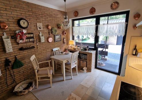 Hervorzuheben sind der im Wohnzimmer in der tieferliegenden TV-Ecke gelegene offene Kamin (derzeit ist ein maßeingepasster Elektrokamineinsatz mit schöner Beleuchtung und zusätzlicher Heizfunktion verbaut), der vollbeheizte Wintergarten mit Kamin und automatisch gesteuerten Lammellenjalousien, sowie die sehr geräumige Außenterrasse mit integriertem Gasgrillkamin.