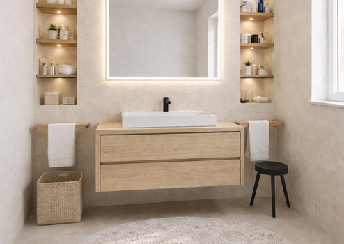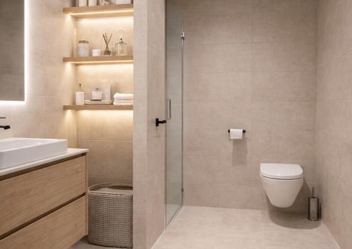 - helle Feinsteinzeug-Fliesen 30 x 60 cm im Nutzflächenbereich des Kellers