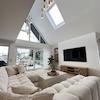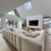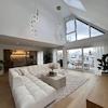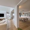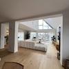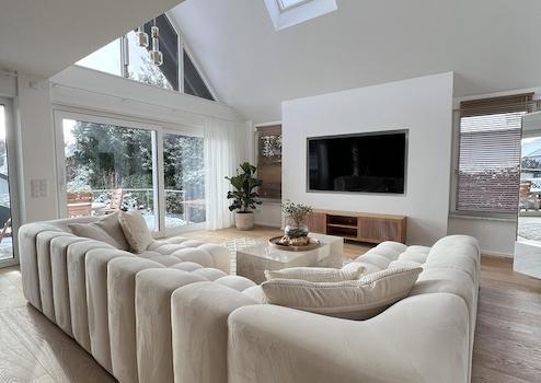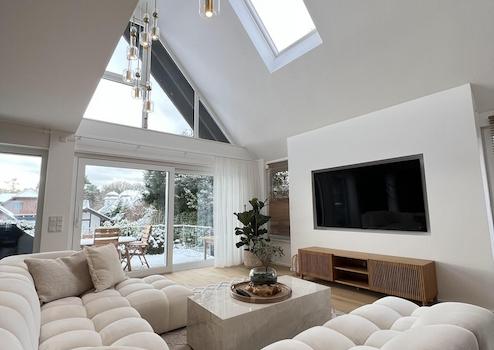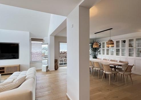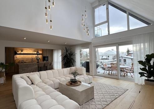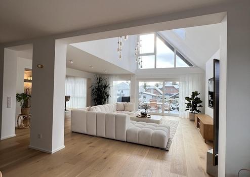 Der Mittelpunkt der Wohnung ist der außergewöhnlich großzügige, offene Wohn-, Ess- und Küchenbereich. Große Glasfronten sorgen für eine beeindruckende Lichtdurchflutung und schaffen eine fließende Verbindung zwischen Innen- und Außenbereich. Von hier aus gelangt man direkt auf die Terrasse und in den weitläufigen, exklusiv nutzbaren Garten. Die moderne Designküche ist vollständig ausgestattet und fügt sich harmonisch in das offene Wohnkonzept ein.