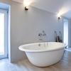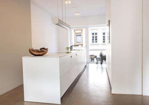 Für den Innenausbau wurden ausnahmlos hochwertige und nachhaltige Materialien eingesetzt, wie massive Eichendielen und Sichtestrich Gussböden, Einbauschränke, bulthaup Küche, Sanitärinstallationen von Grohe, Dornbracht, Kaldewei (frei stehende Badewanne).