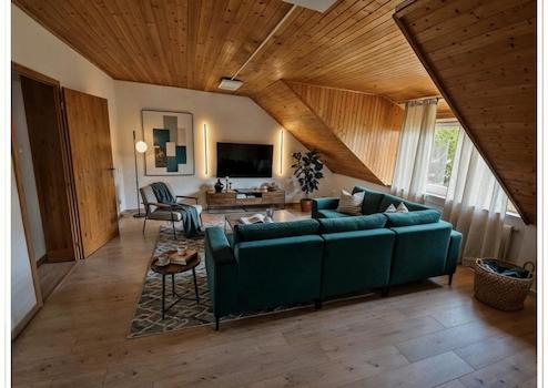 Das ca. 30 m² große Wohnzimmer bietet reichlich Platz für einen Essbereich und eine aufgelockerte Wohnzimmermöblierung.