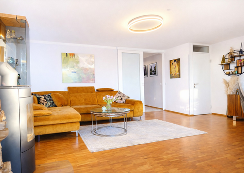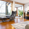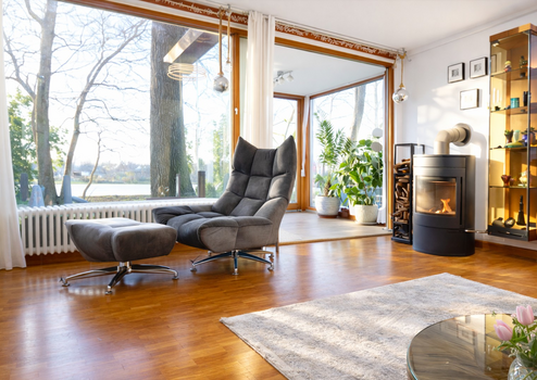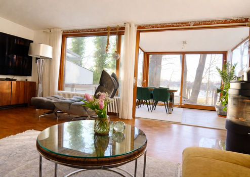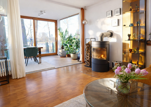 Der helle Wohnbereich bildet das Herzstück des Hauses. Ein Wintergarten und große Fensterflächen schaffen eine freundliche Atmosphäre und bieten einen schönen Blick ins Grüne. An kühleren Tagen sorgt der Kamin für eine besonders gemütliche Stimmung und lädt zum Entspannen nach einem langen Spaziergang ein.