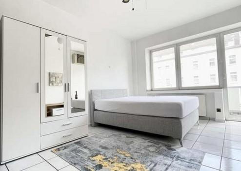Die Wohnung ist voll möbliert, mit einem Boxspringbett, Tisch, Einbauküche, Sessel, Kleiderschrank und Kommeode.