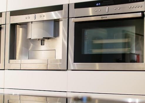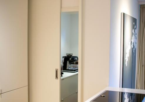 Design-Küche mit hochwertigen Geräten und angrenzendem Hauswirtschaftsraum