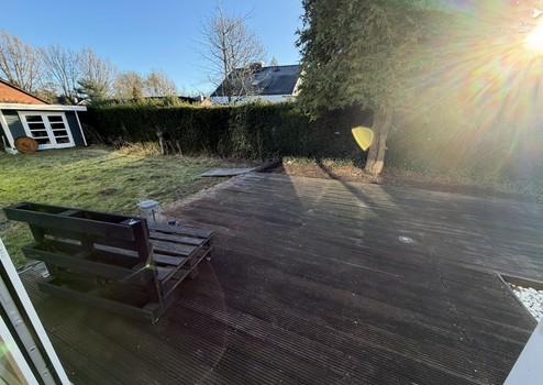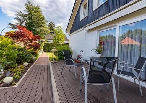 Der liebevoll gestaltete Garten mit zwei elektrischen Markisen und einer großen Bankirai-Terrasse (ca. 70 m²) bietet perfekte Voraussetzungen zum Entspannen und Genießen.