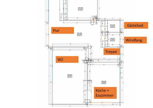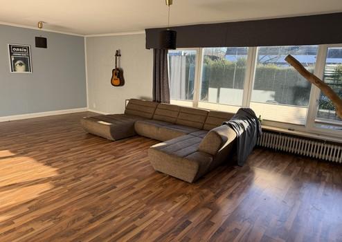 Das riesige Wohnzimmer mit halboffenem Übergang in die Wohnküche besticht mit großer Fensterfront und der Option zur einfachten Installation eines Kamins, da der Schornstein noch einen freien Schacht bietet der von hier zugänglich wäre.